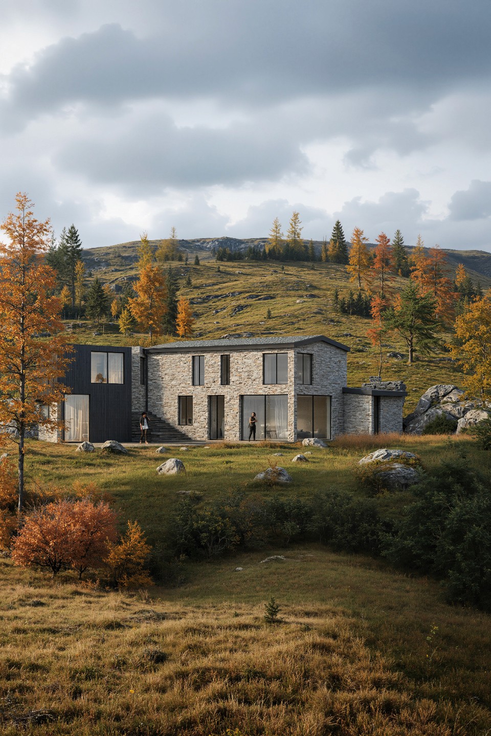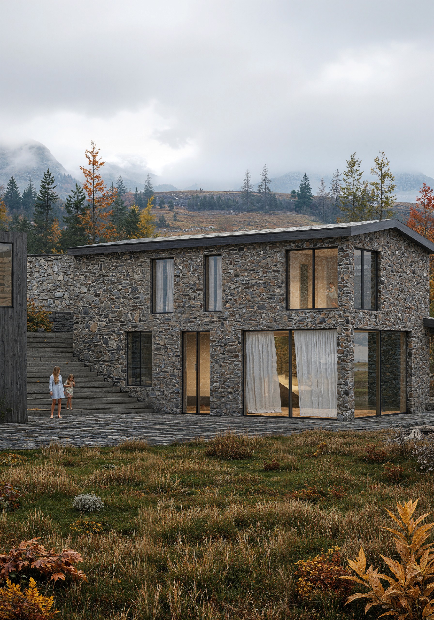 Architecture and nature merge: open terraces and transitional spaces invite outdoor living, while structural concrete, wood, and local stone establish a material connection to the site.